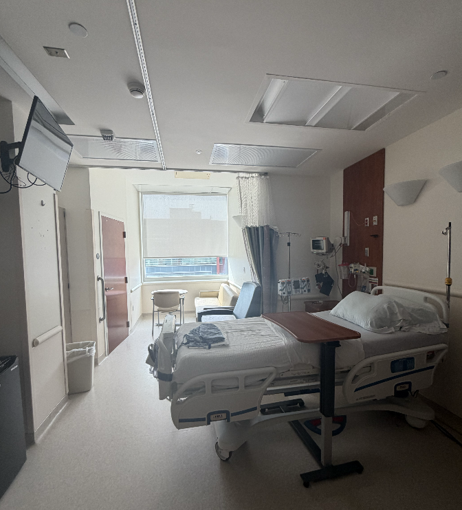 I felt joy and sadness at the same time. I conveniently stepped into the bathroom inside of my room so that I could hide my eyes which had begun to well up a little bit. I took a deep breath and quickly got myself back to normal (kind of). The room is big, has a little sofa area, bed, its own bathroom, and a decent view of the city. It was hard to picture being in there for three weeks, but I know the time in the hospital is just a blip on the radar as it compares to the rest of our lives. I can have visitors, so that is nice. You can watch something on my Michael Scott flatscreen with me.